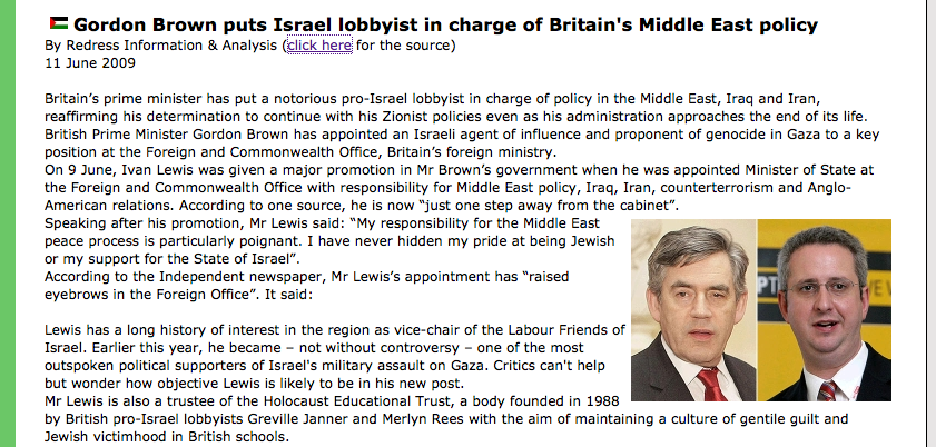 You may be feeling slightly uncomfortable now about such free use of the word ‘Jews’ when the norm in this discourse is to use terms like ’Zionists’ or ’Israelis’. You fear that I am about to launch into a diatribe, Nazi style, about a Jewish conspiracy or even quote the fraudulent Protocols of the Elders of Zion. Well, Oborne was careful to state that they found no evidence of a conspiracy as such and yet there is no doubt that the use of free tours of Israel for hundreds of MPs, the donations from Jewish businessmen to sympathetic parliamentarians and the pressure on media editors from Jews in positions of influence and power does have the nature of a conspiracy. It may not be co-ordinated or directed by any central body but then does it need to be? The clarity of the aims of the Zionist project, for Jews to acquire, in time, the whole of ‘Biblical Israel’ (including ‘Judea and Samaria’ – the West Bank), by any means necessary, is a sufficient organising principle to work from.
