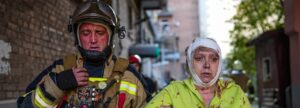 A fireman helps injured civilians after several explosions rocked the Shevchenkivskyi district of the Ukrainian capital of Kyiv on October ...Read more