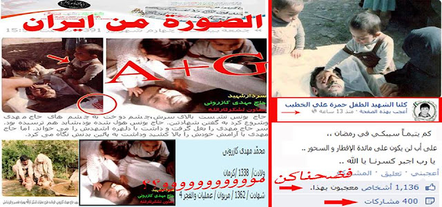 #FdhnakonMoo #Syria #Iran #تضليل_اعلامي #ايران #سوريا فضحناكن مووووووووووو؟؟ يرجى النشر و المشاركة و هام جدآ جدآ مازال مسلسل الكذب والفبركة مستمرا أتباع فورة التزييف و النفاق لا يملون #الكذب و الفبركة ويبدو انهم لم يتركون أي وسيلة لتجييش العواطف إلا و يستخدمونها حيث قاموا بنشر هذه الصورة في معظم التنسيقيات للقول انها في سوريا بعد البحث والدقيق تبين ان الصورة من ايران للشخص اسمه محمّد مهدی کازرونی ولادت/ 1338 /کرمان يعني تاريخ الولادة 1960م شهادت / 1362 / مریوان / عملیات والفجر 4 يعني تاريخ الاستشهاد 1984م A+G رابط الصورة الاصلي http://shahid-suq.blogfa.com/tag/سردار-شهید-حاج-مهدی-کازرونی رابط تاني : http://www.javadol-aemeh.blogfa.com/post-129.aspx رابط الصورة من صفحة الفورة كلنا الشهيد الطفل حمزة علي الخطيب https://www.facebook.com/photo.php?