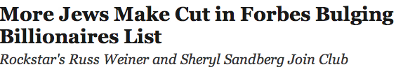 Earlier this week, Forbes released its annual list of the world’s billionaires, which now includes 1,826 people – a record. According to a recent article published by The Jewish Daily Forward highlighting the Forbes list,“Jews are disproportionately represented on the roster of the world’s wealthiest, with 10 Jews among the top 50.”