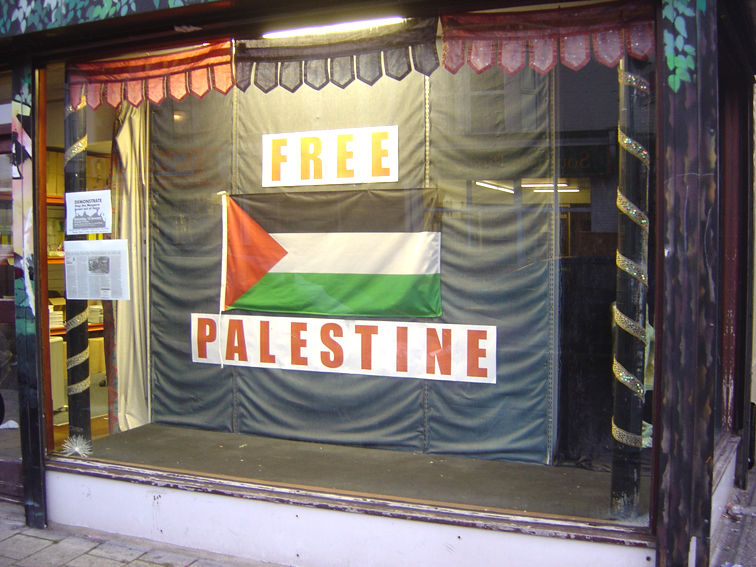 I wouldn’t normally blog about work related stuff, but since this video has achieved mini-viral status I thought I’d let people know the story behind it.After the Israeli air attacks on Gaza in December 2008 / January 2009 the people at my workplace all agreed that we should use our window on Fawcett Road to show our outrage – and our solidarity with the Palestinian people. In the grand scheme of things it’s not exactly the greatest act of resistance, but no matter how small a gesture, it felt that we were at least doing something.The window remained unchanged from the picture above until May 2010 when Israeli commandos boarded a flotilla of ships carrying aid to Palestine, gunning down nine activists in the process. At that point we added the words “ISRAEL = TERROR STATE” at the bottom of the window display. It wasn’t long before we had a visit from the local Community Wardens – old bill wannabes – demanding to know when we planned on removing the protest as they feared it might be contentious. We explained, patiently and at great length, that this was a legitimate political comment, proven by recent Israeli actions. We assured them that it was in no way a comment on a particular faith and pointed out that a number of us had spent years actively fighting racism and fascism in the city. Not surprisingly we refused to remove either the flags or the words from the window.By September we were visited by another police officer – the one in the video – who opened his “little chat” with the fantastic “I have to acknowledge that my knowledge of this is… quite limited”! Indeed. Perhaps this explains why he didn’t feel like sticking around to debate the issue. His comment that they had received two complaints, “One from a Jewish woman, and one from a member of the public” was as absurd as it was, I believe, untrue. Can you be a Jewish woman and not a member of the public?The whole sorry saga came to a head last year when two uniformed officers came to our door, threatening us with arrest unless we took down the ‘offensive’ material.