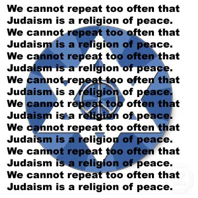 Anyway, please repeat after me: Judaism is a religion of peace, despite everything we see and hear every day in the newspapers and on TV. Not all Jews are terrorists, even though it seems that way because of the way the media focuses on the Jewishness of every Jewish malefactor. In our 100-year-war against Jewish terrorism, we must not condemn the entire Jewish community for the actions of the small minority of IDF-supporting extremists.