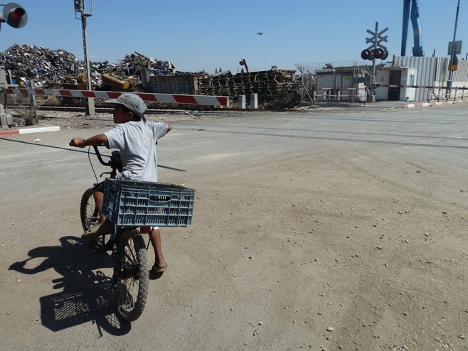 A child from Dahmash prepares to cross train tracks to enter the road leading to the neighboring city of Ramle.